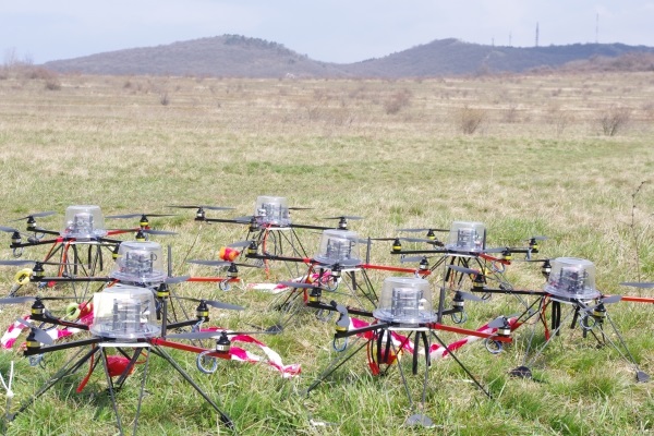 A négyrotoros drónokról készült videón jól látható, ahogy a hajnali ködben a világító diódákkal felszerelt drónok úgy repkednek a levegőben, mint egy madárraj. A kvadrokopterek GPS-vevők segítségével tájékozódnak, egymás helyzetét pedig rádiós kapcsolaton osztják meg egymással. Erre azért van szükség, hogy a drónok ne ütközzenek egymásnak a bonyolult manőverek végrehajtása közben sem. Mindegyik robotrepülő saját maga számítja ki repülési útját.