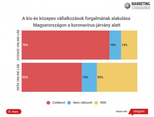 A gyenge online lábbal rendelkező cégek 76%-ának csökkent a forgalma, 10%-ának stagnált, 14%-ának pedig javult. Lényegesen kevésbé érintette kedvezőtlenül a koronavírus-járvány hatása az erős online lábbal rendelkező vállalkozásokat. 52% forgalma csökkent, 13% esetében nem változott és 35%-é nőtt.