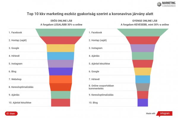 Ezzel szemben az online kevésbé fejlettebb cégeknél a divatos és „olcsó” eszközök vannak túlsúlyban. Például az Instagram a harmadik, miközben a webshop nem fért fel a tízes listára, igaz, éppen csak lecsúszott a 11. helyre.